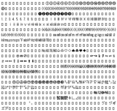 | 反対に使ってはいけない記号だが、これはMacとWindowsでは表示が違っちゃうから例示するのが難しい。下記はMacの場合の使ってはいけない記号類をテキストエディターに表示させたもののGIF画像だが、筆者はWindowsを持っていないからWindowsの場合の表示を例示することは出来無いのである。とにかく、このページを見たMacユーザーは、下記の記号類をE-MailやHomePageで使ってはいけない。絶対に駄目である。Windowsの場合で言うと、下図にはないものがあるはずだが、あるものについては使ってはいけないと言うことになる。 |