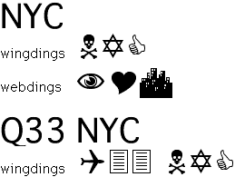NYC(New York City)の文字(半角英大文字)を「wingdingsフォント」で表示すると「髑髏・ユダヤのマーク・やったぜベイビー」になるのだ。これは前から指摘されていたようで、マイクロソフトは「webdingsフォント」を後からリリース。こっちで表示すると「I Love NY」になる。
