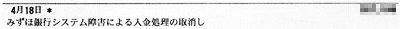 追記:その後の新聞報道によれば、システム・トラブルはATMだけに限らず、一般の送金、公共料金やクレジットカードの引き落としも目茶苦茶になっているとのこと。ついさっきのNHKのニュースによればセゾンの二重引き落としなんてことまで起きている。確かに筆者の口座もセゾン系の4月4日の引き落としが全て行われていない。
