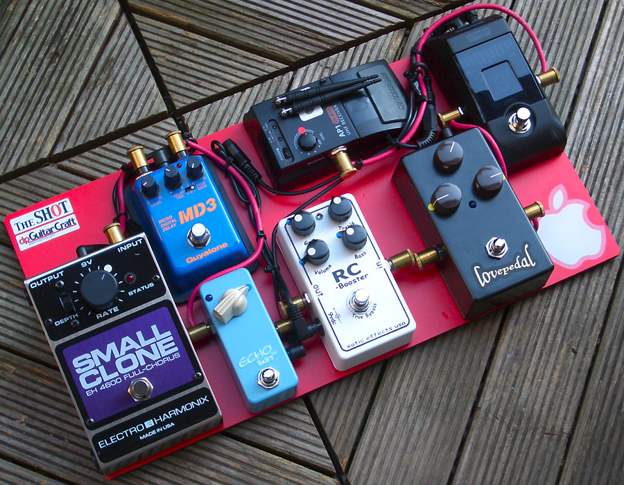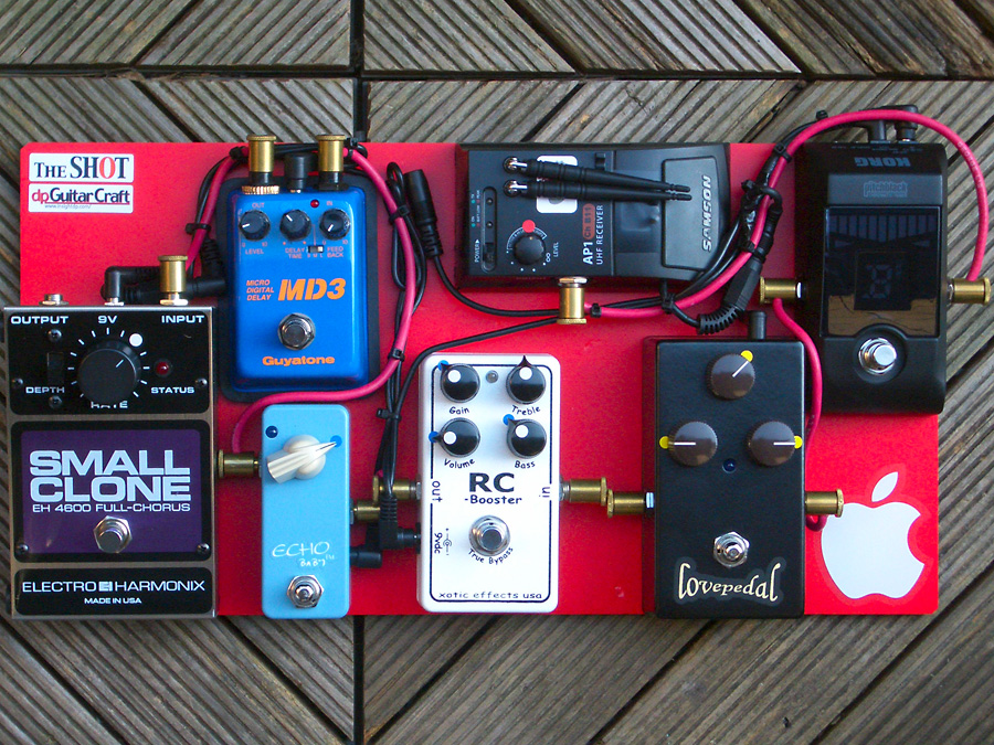 - なので(上の写真のように)George L'sのパッチケーブルのプラグが互い違いになるようにしてペダルを接近させたレイアウトにする