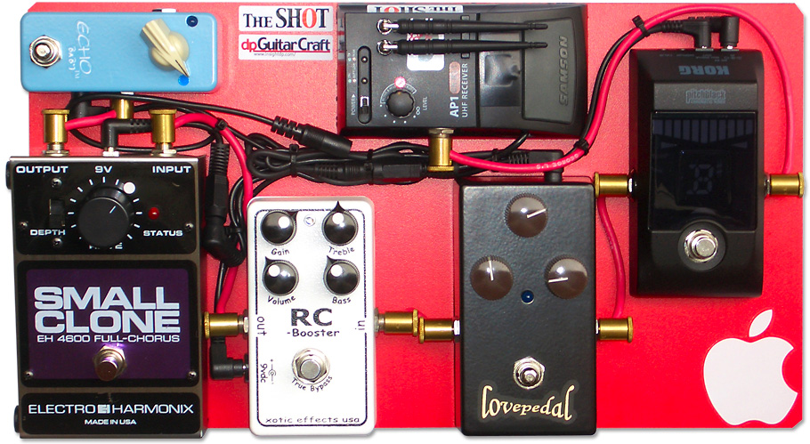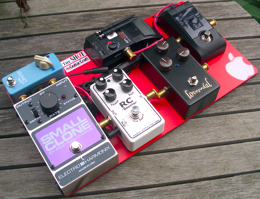 Lovepedal ETERNITYのゲインを低めに設定することによって、ギターのボリュームの加減でセミ・クリーン〜クランチが自在に操れる。古めのロックもOK。ソロの時などにもっとゲインが欲しい場合はRC-BoosterをON/OFFする