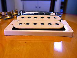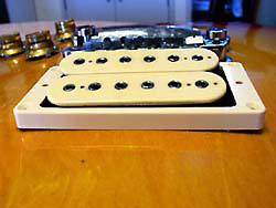 苦労して完成。なお、ピックアップとエスカッションの隙間にはスポンジを詰め込んでがたつきを無くしてある。またピックアップの裏にもスポンジが入れてあり、ピックアップと弦が平行になるように調整してある