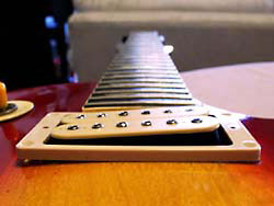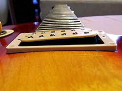 となると、また20年後に割れちゃうのは馬鹿らしいから、手間はかかるけど慎重な作業でボディに合わせてエスカッションの底部をカーブ状に削ってフィットするように加工した。国産のパーツ、あるいはDiMarzio製には最初から底部が湾曲しているものもあるのだが、どう言う訳か、その湾曲具合が強すぎて、少なくとも筆者のLes Paulとはこれ又フィットしない。まったく変な話である。