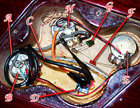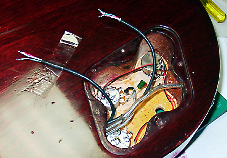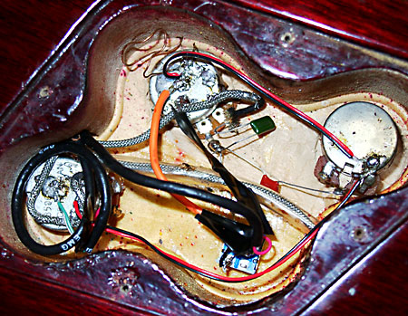 | 完成した筆者オリジナルの配線状態。もしも外観を変えたくないのなら、トーン・ポットをスイッチ付きにすればいいが、ブリッジ側のトーンは絶対に使わないし、外観が変わるのは新鮮でよろしいというのが筆者の考え方。配線の詳細は下図参照 |