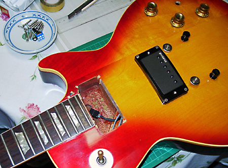 - 早速、接続テスト(この時点ではまだ「ON-ON, 6P」スイッチはLes Paulには取り付けない)。こういう場合は弦を張っていないわけだから、ピックアップのポールピースをドライバーなどの金属の先端でコンコンと叩けばよい。もちろんギターの出力はアンプやエフェクターに接続する必要がある。もちろん、テスターを使うと言う手もあるが筆者は純粋文化系工作大好き人間なのでテスターなんてモノは持っていないし使い方も判らない