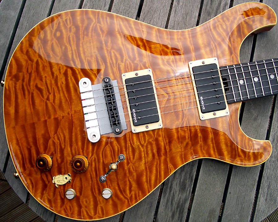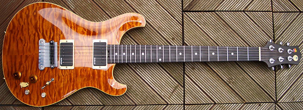 フロント・ピックアップに少々のリア・ピックアップが混ざったサウンドは、普通のGibson系のフロント・ピックアップの太くて甘い=場合によっては低音がややブーミーに感じるような=サウンドと違って、当然、それよりは固めのトーンであるが、ボリュームを少し絞ればカッティングに最適だし、フルテンなら太さと同時に音がぐっと前に出るトレブル(高域)を併せ持つのでソロに最適で筆者的には非常に使い易い。勿論、ハムバッカーの普通のフロント・ピックアップのサウンドじゃなくちゃ嫌だという人にはまるで向かないであろう(数ページ前には「ノーマルのフロント・ピックアップのサウンドが出ないのは困る」と書いたのは筆者だが【苦笑】)