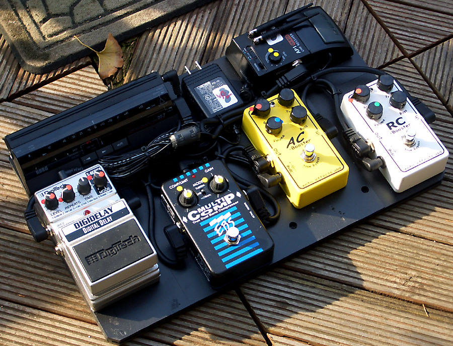 現場のギターアンプの音色の差をXotic RC-Boosterで補正して、ギター側フルテンでクランチ気味になるようにセッティング。DigiTech DigiDelayはMODモード&タップテンポ入力で常時ON。ディレイのレベルはかなり高目。いずれにせよ、Xotic RC-BoosterとDigiTech DigiDelayは常時ONである(→ 操作の単純化)
