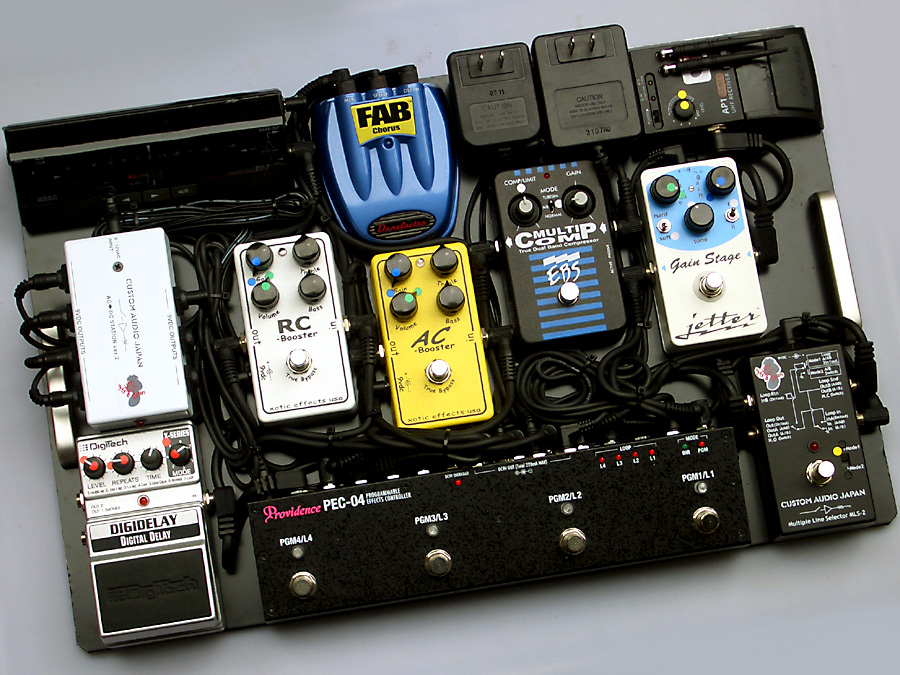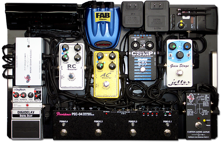 MLS-2 Multi Line SelectorでProvidence PEC-04をバイパスした状態。Jetter Gear Gain Stage Blue Pedalのセッティング次第でクリーン or クランチを選べるが、基本はクリーン、つまりゲイン=ゼロである。Jetter Gear Gain Stage Blue Pedalの「I/II スイッチ」が「I」だと、ほぼアンプ直と同じサウンド、「II」だとストラトと言うかシングルコイルというか、ハイ上がりのカッティングに最適なサウンドになるので、接続するギターアンプや演目によって、その都度、最適な方を選ぶ、またはその日の気分で選ぶと言う柔軟 or お気楽な発想で行くことにした