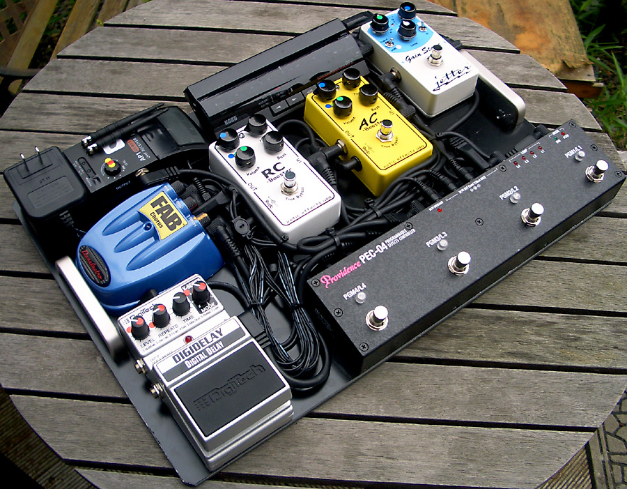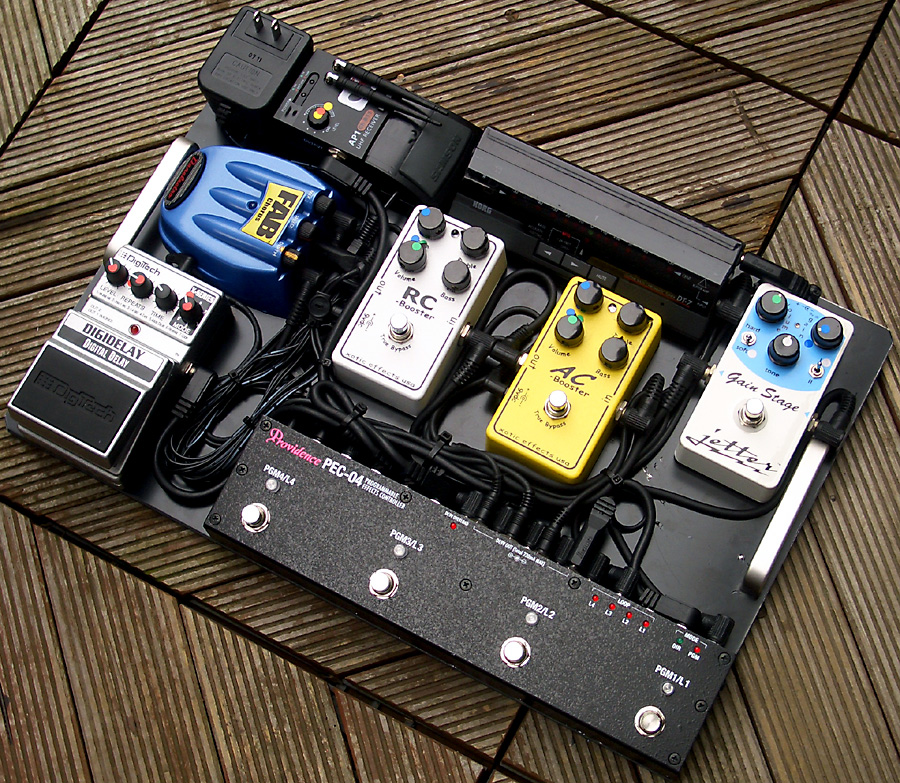 Jetter Gear Gain Stage Blue PedalとDigiTech DigiDelayで作るクランチ・サウンド。ギターのボリュームを絞ればクリーンになるようにセッティング。Jetter Gear Gain Stage Blue Pedalのキャラクター・スイッチでファット系とハイ上がり(ストラト)系を選べるのが便利
