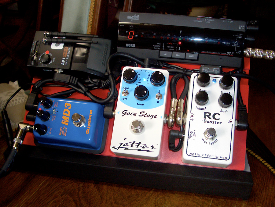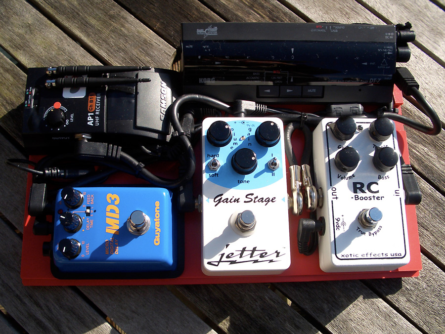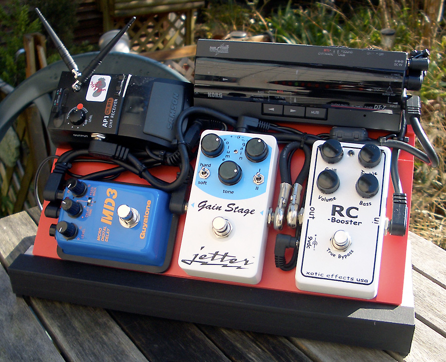 これでOKとなったら「次の計画」へ突入であるが、現時点ではレイアウトと配線は下記のいずれかになる筈である。なお、ノイズ・ゲート=BOSS NS-2と仮定=は自身のループ内にノイズを消す機材を入れる。そして、ディレイ系・空間系はノイズ・ゲートより後にするのが常識である。なので、配線は下図のごとくにかなりややこしくなる。AC-Boosterについては、気が変われば使う可能性もある(ノイズの問題はNS-2で解決出来る)ので、載せた状態でレイアウト試案を作ってある。なお、パッチ(ループ)数の関係から、Guyatone MD3がDanelectro FAB Chorusの前に来ることになる。