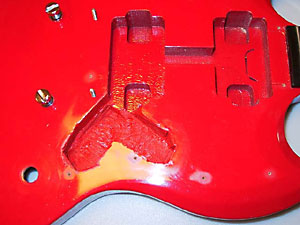 と言うわけで、昼食を済ませてからまたしても木工作業に精を出すことになった。その結果は上の写真の通り。これでSGのストラト化大作戦第一段階完了。 |