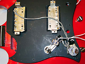 こうなるとエレクトリック・パーツは全てストラトと同じくピックガードに取り付けることが出来る。よって、配線も無駄がなく簡単ですっきり。どう考えてもSGのオリジナル状態よりも合理的である。