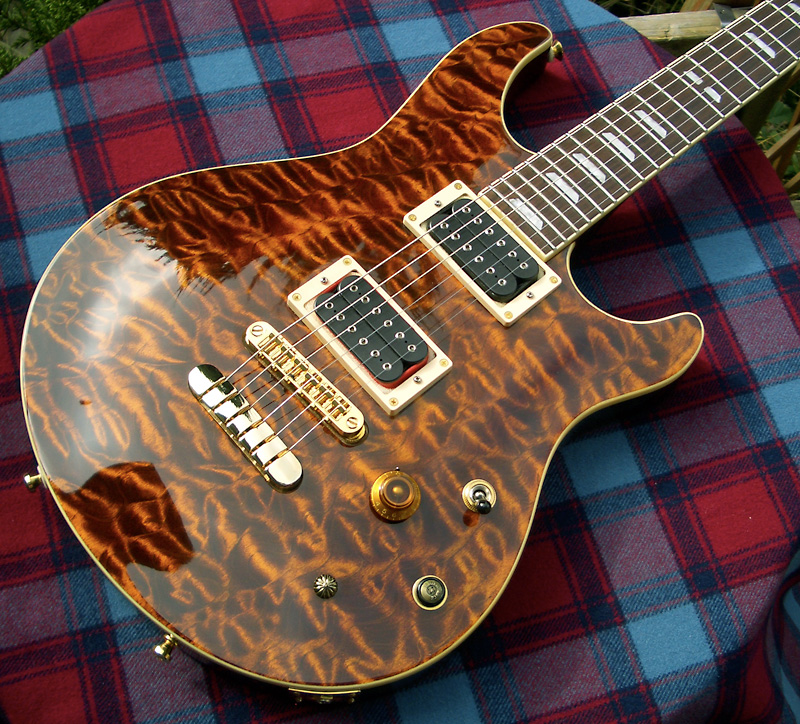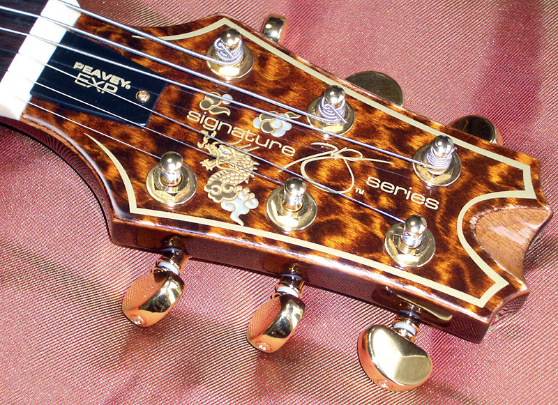 | これにて完全に完成♪ 後は使い込むだけ慣れるだけ弾くだけ練習するだけ。ところで。このPeavey HP EXP Tiger Eyeは、なな何と24フレット仕様。そう言えば、だからフロントとリアのピックアップの間隔が狭く感じるのだな。そして、ネックの裏は斜めカットの理想的なヒールカットになっており、ハイポジションは恐ろしく弾きやすい。改造後のLes PaulやGM8Rなんか比べものにならない。やっぱ基本設計は大事である(当たり前だ)。 |