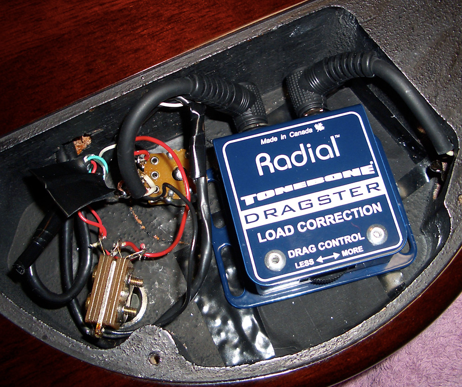 | このRadial TONEBONE DRAGSTERはメーカーの効能書きによれば「全てのギタリストはギターアンプ直のサウンドを最高だと感じている。そのギターアンプはハイ・インピーダンス受けである。ところがワイアレスもエフェクターもミキサーも全てロー・インピーダンス受け(と言うかバッファー・アンプ受け)だから(ハイ・インピーダンス受けのギターアンプとは当然まるで)違った=痩せた=サウンドになる。そこで、ギターとバッファー・インプットを持つ機器の間にDRAGSTERを噛ませれば(パッシブ・ピックアップの)ギターの出力インピーダンスを最適化して、音痩せを解消し、ギターアンプ直のリッチなサウンドを再現出来る」と言うものである。 |
