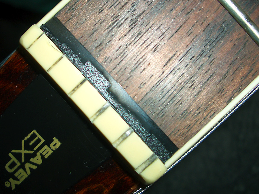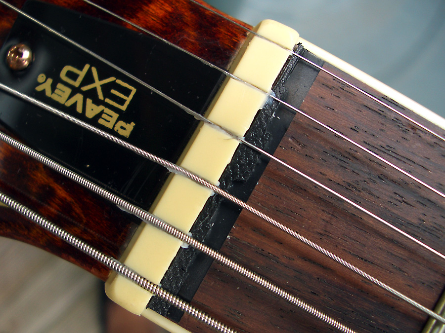 | もうひとつ。前ページの続き。例のイントネーション調整用のパーツであるが、2枚の貼り合わせを両面テープにしていたために弦との摩擦でずれてきた【爆】。これじゃイントネーションもクソもないのでイチから作り直しをし、同じ素材が実は瞬間接着剤でくっつくことを確認してからきちっと接着。木部との半固定は相変わらず両面テープだが、こちらは接触面が大きいのでずれそうにないから大丈夫。 |