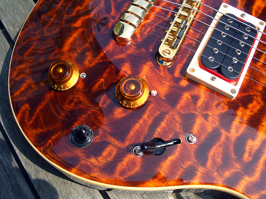 | ことのついでに、ボリューム・ポットとトーン・ポットの基準点にも印の代わりに一個ずつ貼り付けたのが下の写真。これなら全く邪魔にならず、時としてライティングでビカッと光るというわけである♪ 結構、馬鹿だ>自分。 |