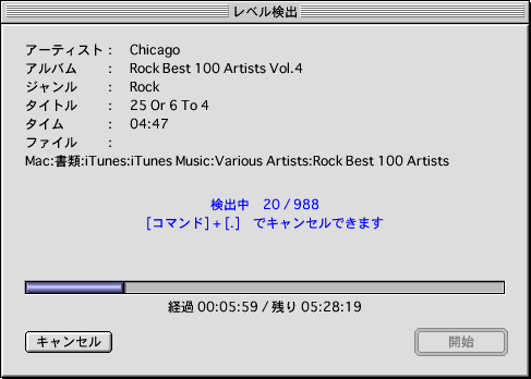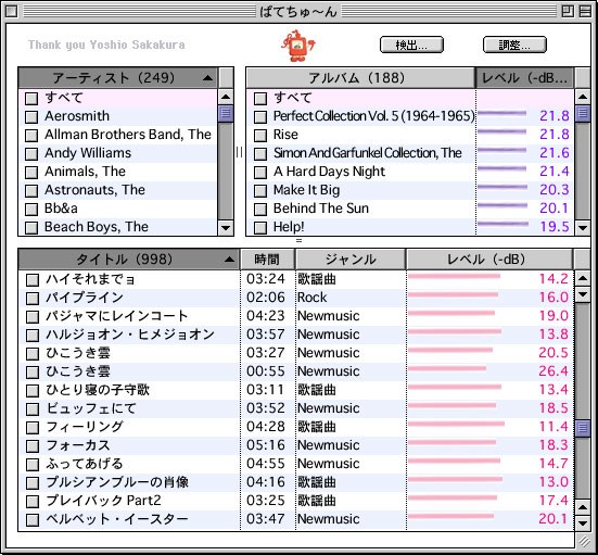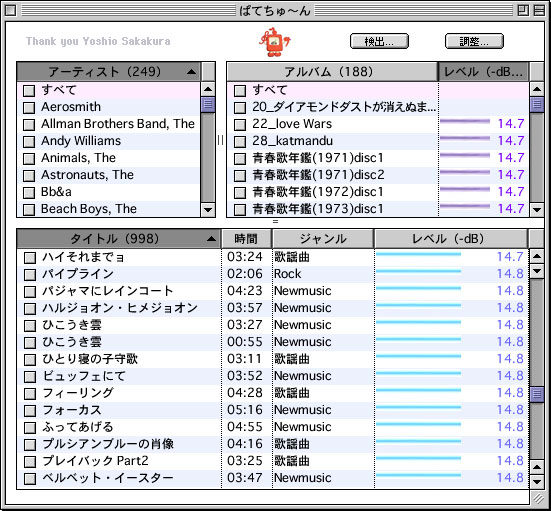 検出に掛かる時間について「ぱてちゅ〜ん」のマニュアルにはPowerMac G4/800 Dualで1,000曲ちょっとに5時間ぐらい掛かると書いてあるが、我が家のPowerBook G4/400で988曲をチェックしたら5時間半掛かった。つまりCPUのクロック・スピードはあんまり関係ないようである。きっとAltiVec (Velocity Engine)が大活躍するのだろう。と言うことはG3での検出はつらいかもしれない。いずれにせよ、普通は出掛ける前とか、夜中とかに実効した方がよいだろう。