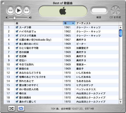 全集モノ的なプレイリストは年代順に再生されるのが望ましい。ところがiTunesでCDからリッピングするとアルバムの年代データしか入らない。ベスト盤で言えば、そのベスト盤の発売年度になってしまう。つまり昭和40年代の歌謡曲の全集モノでもたとえばそれが今年の発売のCDなら全曲2002年になってしまうわけだ。