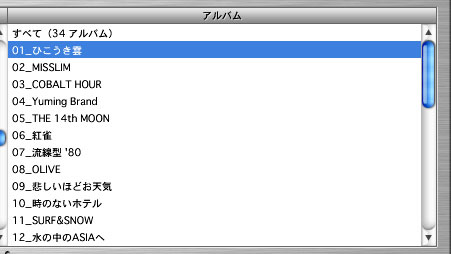 | iPodのファームウエア・バージョンが上がってからアルバムでの選択が出来るようになったのは良いのだが、並ぶ順番はアルバム名のアルファベット順である。Yumingみたいにアルバムだけで34枚もあると発売順まで憶えてられない。こういう場合は下記のようにアルバム・タイトルの前に番号を振ってしまえばよい。そうすれば個別のプレイリストを作ったりしなくても、ちゃんとiPod上で順番に並ぶのだ。但し、こんなことをする必要があるのは筆者の場合はYumingだけなので大きな問題ではない。 |