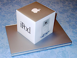 | と、最初は見事に肩すかしを食らったわけだが、とにかく今、Macの世界では話題沸騰(なのかな??)のiPodであるのであるのである。期待に胸をふるわせて茶色い外箱を開けると見事にデザインされた銀色の立方体の化粧箱が現れた。 |