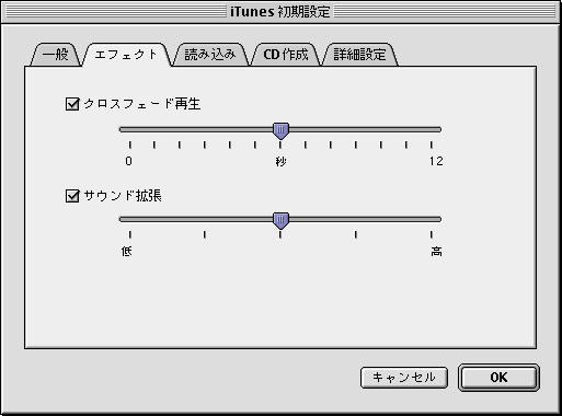 クロスフェード再生をオンにすると曲間が途切れることなく、文字通りラジオの音楽番組のようにクロスフェードされるが、フェーダーを右にやり過ぎると前の曲のエンディングにもろに次の曲のイントロが被るので中央より右にしない方が良いだろう。