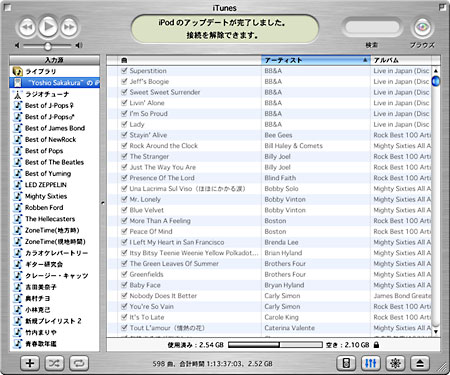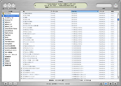そして、一度、シンクロが完了すると、それ以降は差分コピー(または削除。とにかくPowerBook G4側と全く同じにする)だから一瞬で終わるのだ。とにかくFireWire装備のMacintosh専用のApple純正ハードウエア=iPodと純正ソフト=iTunes2だから使い勝手は滅茶滅茶良いと言うわけだ。 |