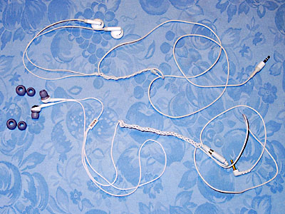 | Apple純正とSONY NUDEの二種類のイヤフォン。左のグレーの丸いのはSONYに付属するLとSの交換用インナーイヤパッド。ウレタン製。結局、最初から付いているMサイズが筆者にはベスト |