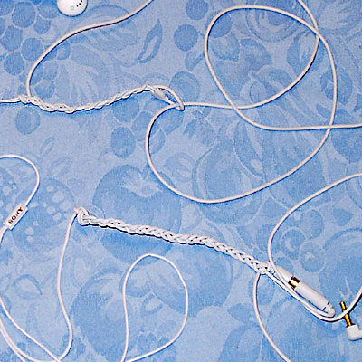 SONY MDR-EX70SLとApple純正ではケーブルの構造が違うので編む場所と編み方は全く違うのだが、とにかく三つ編み部分で全体の長さを短く調整し、その三つ編みで出来る輪っか部分で、さらに余ったケーブルをループさせて取り回しを良くするのである。