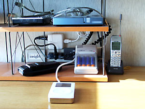 | 目線を下げて撮影した「充電センター」の様子。下段下左の黒いのはブランのシェーバー。その奥にiPodの電源アダプターが見える |