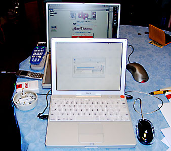 普通の人ならメインマシンとして充分だし、マニア系でもサブに一台欲しくなるぐらいである。筆者だってちょうど一年前にワイフのXmasプレゼントに購入した在庫処分のタキシードiBookが119,000円だったから許せる物の、タキシードiBookにはFireWireが無いという問題はあるわけで、それでも、このタキシード君は事実上はエプソンPM-780Cの無線LANプリンターサーバーとなっているからいいけど、でも遙に小さいiBook(Late 2001)の方が場所を取らなくていいから欲しくなっちゃうぐらいに良いマシンだと思うのである。