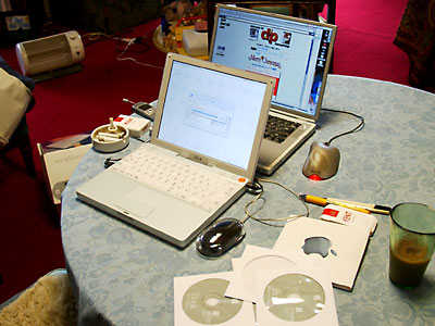 そのiBook(Late 2001)は元々はIBM ThinkPadを使っていたギター仲間氏が「ギター研究会・例会」で筆者に洗脳された結果、購入したもの。当然のように「填めた責任からインストールはしてあげます」と言うことで、AppleStoreからiPodと一緒にうちに納品されたので、完璧なセッティングをしてから「出荷」した。PowerBook G4のメモリーを増設した時に余った128MBメモリーも差して差し上げた。
