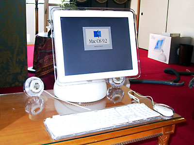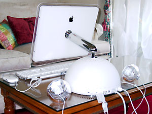 既に色々なサイトで様々な評価がなされているiMac LCDだが、確かに最初はかなり違和感のあるデザインではある。しかし暫くすると慣れてしまう。液晶を支えるクロームの支柱の動きはスムーズかつ確実だし、全体の設計は極めて合理的。「底面の直径26cmの本体部分+液晶の張り出し分+キーボードスペース」は結構な奥行になるが、それが問題なく置ける場所があり、かつ、固定=据置きで使うなら価格対性能比的に現状のMacintoshのラインアップから選べばiMac LCDがベストであるのは確かだ。G4/1GHzデュアルの新型クイックシルバー・ポリバケツは普通のユーザーには必要がないからである。だから……