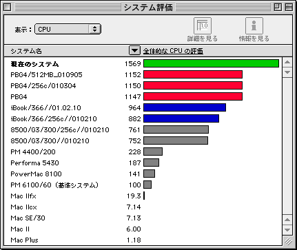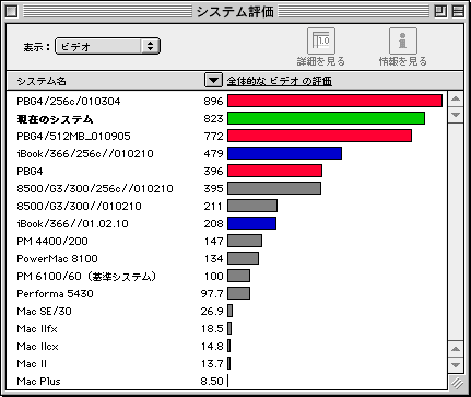 | NortonのSystemInfoの評価で最高のビデオ性能を出すためには256色モードにする必要がある。だからPowerBook G4が一番になっているが、iMac LCDを256色にすれば当然、一番速くなる筈 |