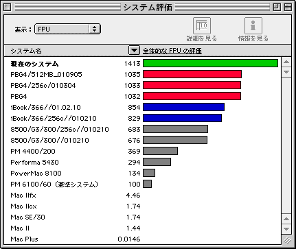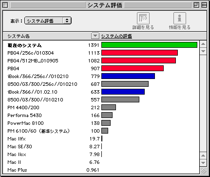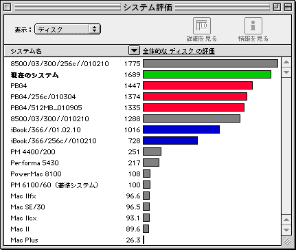 | ディスク性能は何故か以前に使っていたPowerMac 8500/G3のSCSIのHardDisk(9GB)が一番になったが、体感上の速度はiMacやPowerBook G4のATAの方が全然速い |