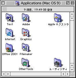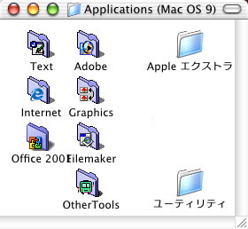 また「Appleエクストラ」と「ユーティリティ」のフォルダーアイコンがMac OS Xではのっぺらぼうになっているが、これは、Mac OS 9.nの場合にはFinderが特別に表示させているカスタムフォルダーアイコンだからで、Mac OS XではMac OS 9.nのFinderは動いていないからすっぴんのフォルダーアイコンになってしまうのだ。こう言うことはAppleがどうかすべき問題だろう。