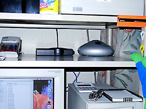 最後の「到達距離=送受信可能範囲」であるが、これは筆者の予想より遙かに遠く範囲も広いことが分かった。最初、先入観から、いわゆる見通し距離である必要があると思い、AirMacベースステーションをワイフが主としてiBookを使う筈のリビング・ルームに置いたのだが、その後で試しに廊下を隔てた別の部屋にあるPowerMac 8500のOAラック上に置いたら何の問題もないのである。途中には明らかにコンクリートの壁があるのだが送受信に全く支障はない。