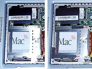 この種の改造(と言うかチューニング)はPowerBook G4の個体差や個人の好み、そして納得の度合いそのものの個人差があるので、上の写真の位置はあくまで筆者の場合の話なのだが、注意しなければいけないと思われるのは、PowerBook G4のキーボードは8カ所のマグネットを使って納まりを良くしているという点である。つまり、スペーサーをマグネットの近くに配置してマグネットの密着が悪くなっては逆効果だと言うことである。