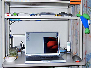 - 会社の帳簿の記帳・整理など机を広く使いたい場合はPowerBook G4を棚の上に載っけてお休みいただく。パワーアダプターは接続したままで大丈夫。マウスはPowerBook G4の上に載せればよい。この状態でも有効奥行は60cmぐらいあるので事務机として完璧に機能する。帳簿の記帳・整理の場合、伝票などが散乱しがちだが、それらを一時的にPowerBook G4の上に待避できるのも便利。普通の机よりも使い勝手が良いぐらいである。