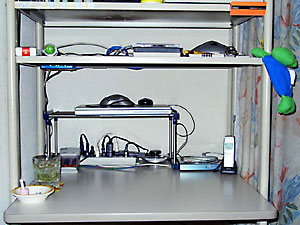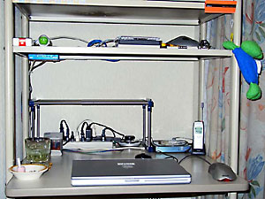 | 上の棚の右がAirMac。その左隣がBA-512ブロードバンド・アクセス・ルーター。棚の下側の左端の小さな青いのがPCIの小型5ポート・ハブ。磁石で逆さ吊り状態。机の上の携帯電話の隣がYANOのCD-R/RWドライブ(USB接続)。左側に斜めに立てかかっているのはデジカメ用リチウムイオン電池の充電器。電源関係は全てその後にまとめてある |
