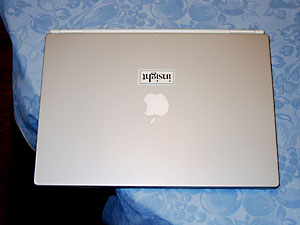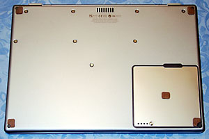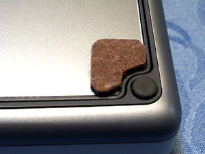 ところで、PowerBook G4の取れやすいことで評判のゴム足は、我が家で使っている、防水加工をした布とビニールの中間のような風合いのテーブルクロスなどにも張り付きやすい。だから、PowerBook G4の位置をちょっとずらそうと思うと、いちいち両手で浮かせて移動しなければならない。片手で押したぐらいではまるで動かないのである。ここで無理をするとゴム足そのものが取れてしまう可能性もある。