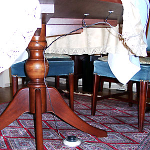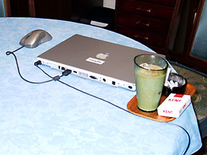 | こうしておけば足で引っかけてPowerBook G4の端子部分に機械的なストレスを掛けることもないし、全く邪魔にならない。テーブルの裏からケーブルを吊っているのは、電源ケーブルに微妙なカーブとゆとりを持たせて、テーブルクロスの端がめくれ上がらないようにする美的配慮だったりする |