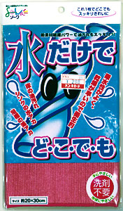 | この「水だけで ど・こ・で・も」は断面形状が☆のような多角形をした超極細繊維を混紡したものなのだが、理屈から言うと東レのトレーシーなどの眼鏡クリーナー用の布と同じく、その極細繊維が汚れをくわえ込んで離さないので、洗剤を使わなくても油汚れなどを拭き取ってしまうと言う優れもの。この機能が液晶画面の取れにくい汚れを見事に除去一掃してしまうらしい。とにかくこれで悩みの一つが見事に雲散霧消したのである。 |