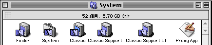 | Mac OS 9.2.1の意味するところはMac OS Xのクラシック環境での親和性であるらしい。だからMac OS 9.2.1のシステムフォルダーには下図のように最初からMac OS Xのクラシック環境で必要となるサポートファイルなどがインストールされる。これらのファイルはMac OS 9.1まではMac OS Xをインストールして、そのMac OS Xからクラシック環境用のシステムフォルダーとして指定しない限りはインストールされなかったものである。 |