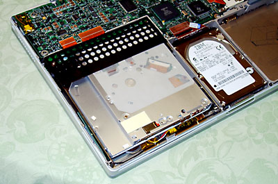 | さて、久々にPowerBook G4を開けるわけだが、PBG4COMBには写真入りの取付説明書はもちろんのこと、ちゃんとトルクス・ドライバーも付属している。だから腕に自信がある向きは自分で取り付け出来るのだが、結論から言うと、一般人は取付は業者に任せた方がよいと思う。それ程、PowerBook G4の中はきっちきちで余裕がない。 |
