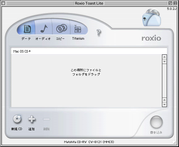 早速、一枚焼いてみたが、700MBを約10分(8倍速)で、ちゃんと焼くことが出来た。ややこしいことは何も考えないで、上のAquaなウインドウにボリュームをDrag&Dropして「書き込み」ボタンを押すだけであった。