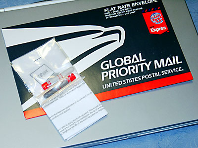 | と言うわけで、すぐにTiPaintのHomePageにアクセスして即、注文。待つ事およそ3週間。エアメールかつ日本国内速達扱いで届いたものは、いかにもアメリカっぽい、チープな見てくれのTiPaint(2色セット)だった。2色というのはPowerBook G4の外装が2色だからである。ばら売りもしているが、どうせだからとセットを注文したのだ。 |