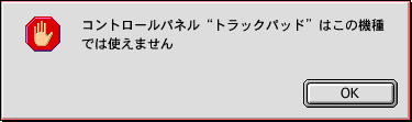 | かくてPowerBook G4の見てくれは個人的に堪えられる状態になったのはいいとして、それとは全然関係ないのだが、つい二週間ほど前、PowerBook G4を再起動したら、起動項目に入れてある「PadOff(トラックパッドを殺すソフト)」が見た事もないアラートを出して終了してしまった。ありゃっ?と思ってトラックパッドに触ってみるとまったく動作しない。そこでApple純正の「トラックパッド(コントロールパネル)」を起動したら、なんと下のアラートが出てしまった。 |