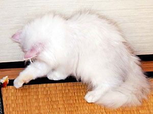 お泊まりついでにシャンプー&トリミングもしたので、また真っ白に戻っためいちゃんであるが、運搬用の鞄に入れた瞬間から、みゃあみゃあ〜みゃあみゃあ〜うるさいことうるさいこと。余程閉じこめられるのがいやらしい。そして帰宅すると、しばらくは人間様にやたらとまとわりつきまくる寂しがり屋のめいちゃんなのであった。ところで、pipiのお預かり記録シート(なんてものをくれるのだ)によれば、食事はちゃんと食べていたそうな。我が家での偏食は単なる我が侭か? |